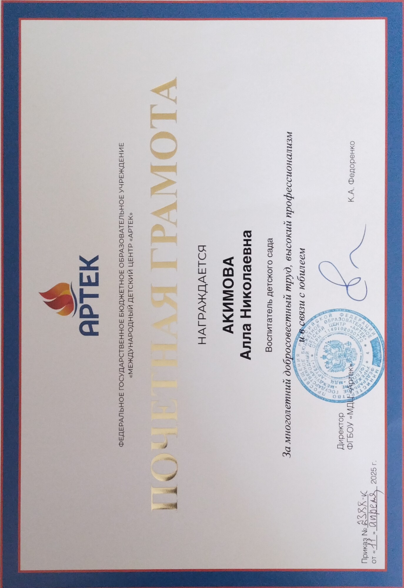 Почетная грамота Директора ФГБОУ «МДЦ «Артек» за многолетний добросовестный труд, высокий профессионализм и в связи с юбилеем (приказ от 11.04.2025г. № 2388-к).