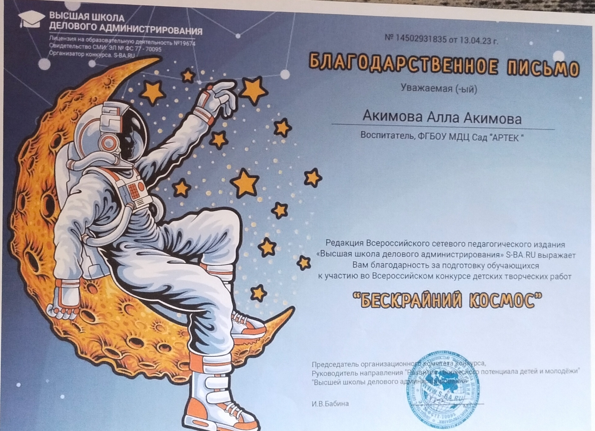 Благодарственное письмо от Редакции Всероссийского сетевого педагогического издания "Высшая школа делового администрирования" S-BA.RU