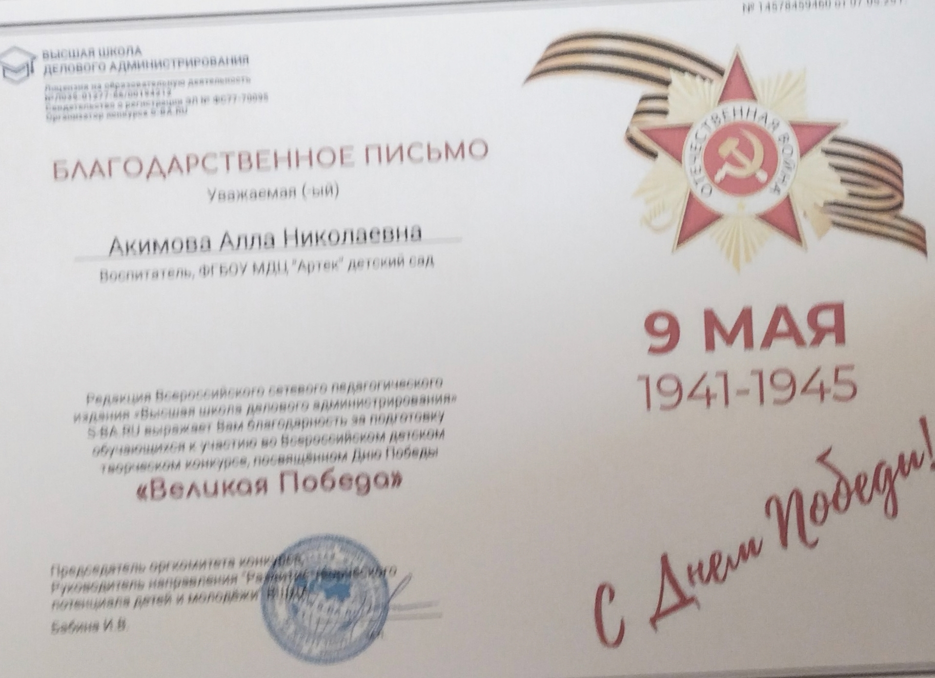 Благодарственное письмо от Редакции Всероссийского сетевого педагогического издания "Высшая школа делового администрирования" S-BA.RU