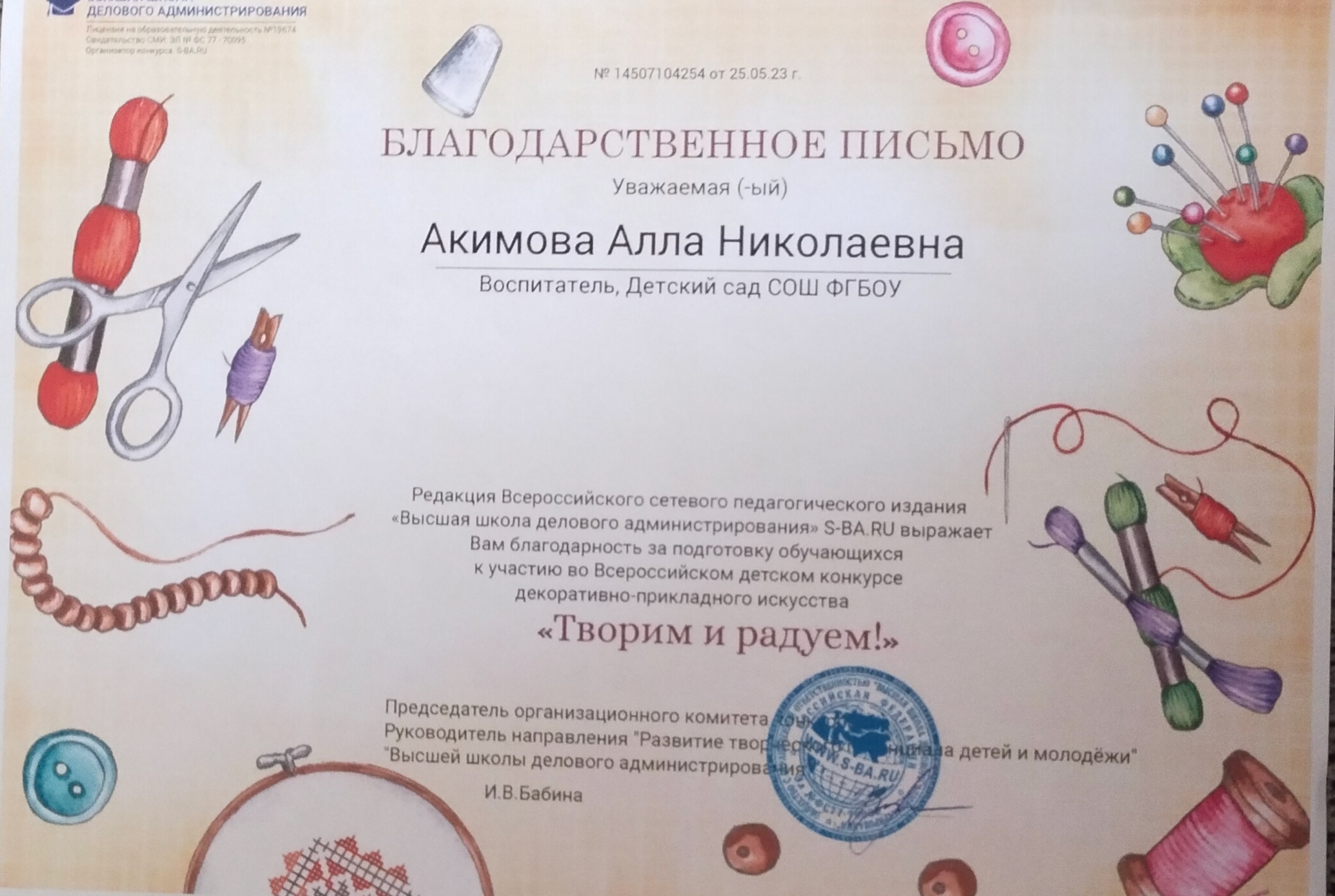 Благодарственное письмо от Редакции Всероссийского сетевого педагогического издания "Высшая школа делового администрирования" S-BA.RU