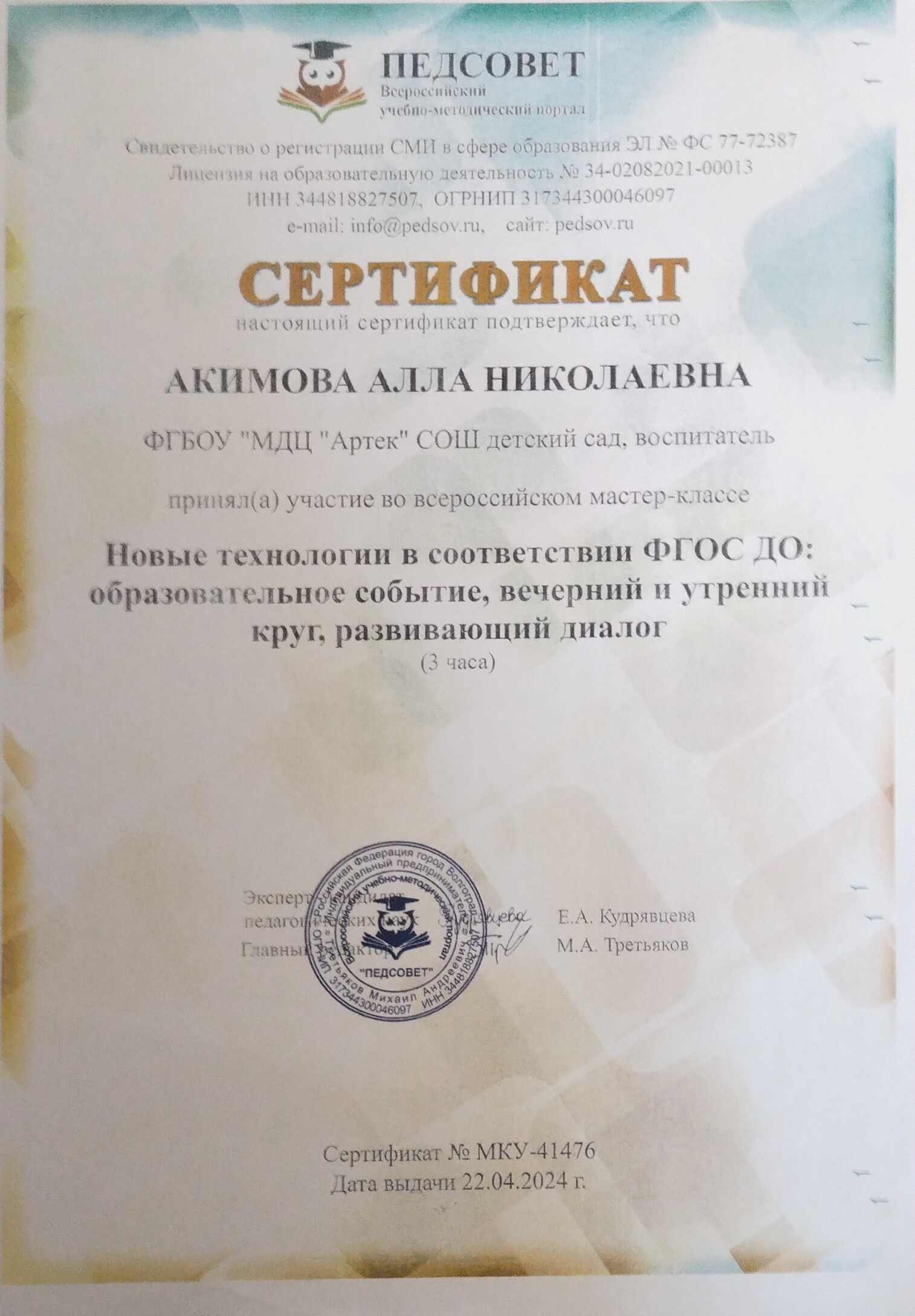 всероссийском мастер-классе «Новые технологии в соответствии ФГОС ДО: образовательное событие, вечерний и утренний круг, развивающий диалог», 22.04.2024г., Всероссийский учебно-методический портал «ПЕДСОВЕТ»
